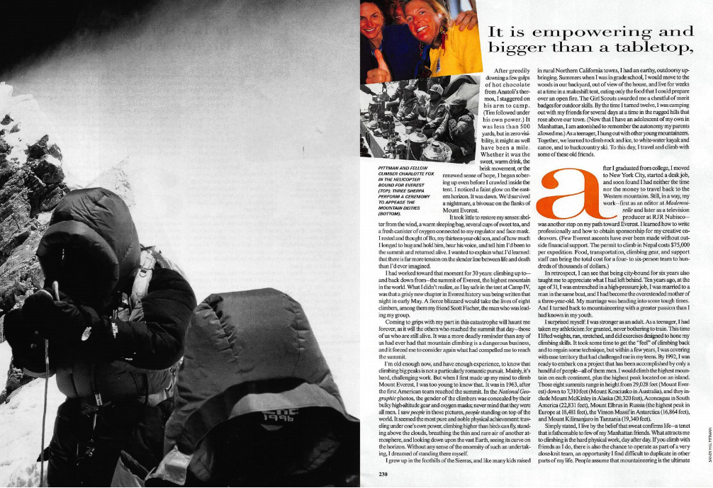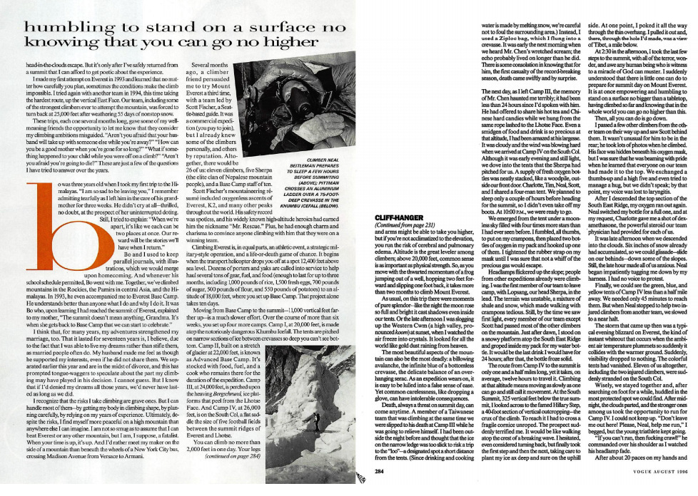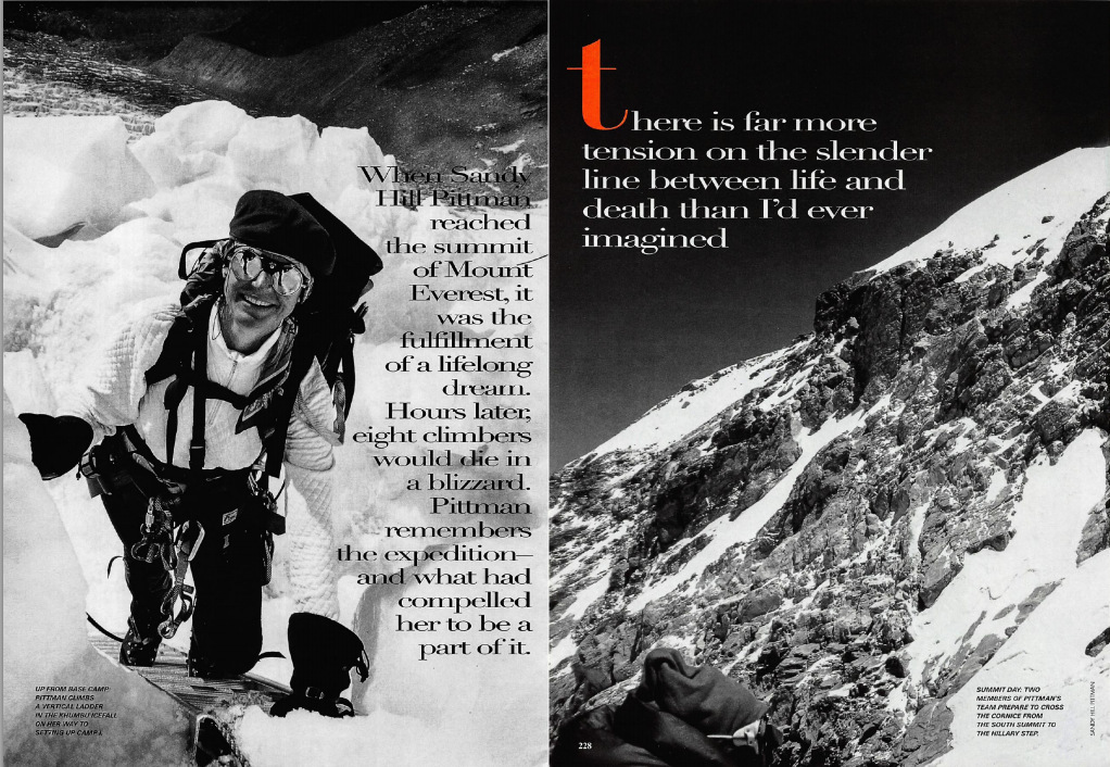 But reaching the summit is only half the journey—and most accidents happen on the way down. Pittman was already very tired; observers from another team say she had to be short-roped by a Sherpa on the way up, and she was the last client in her group to reach the summit, with Fischer following as rear guide. She didn’t have time to do more than snap a few pictures. No one remembers if she had a chance to bury a cross necklace which she had custom-made by jeweler Barry Kieselstein-Cord for that purpose.